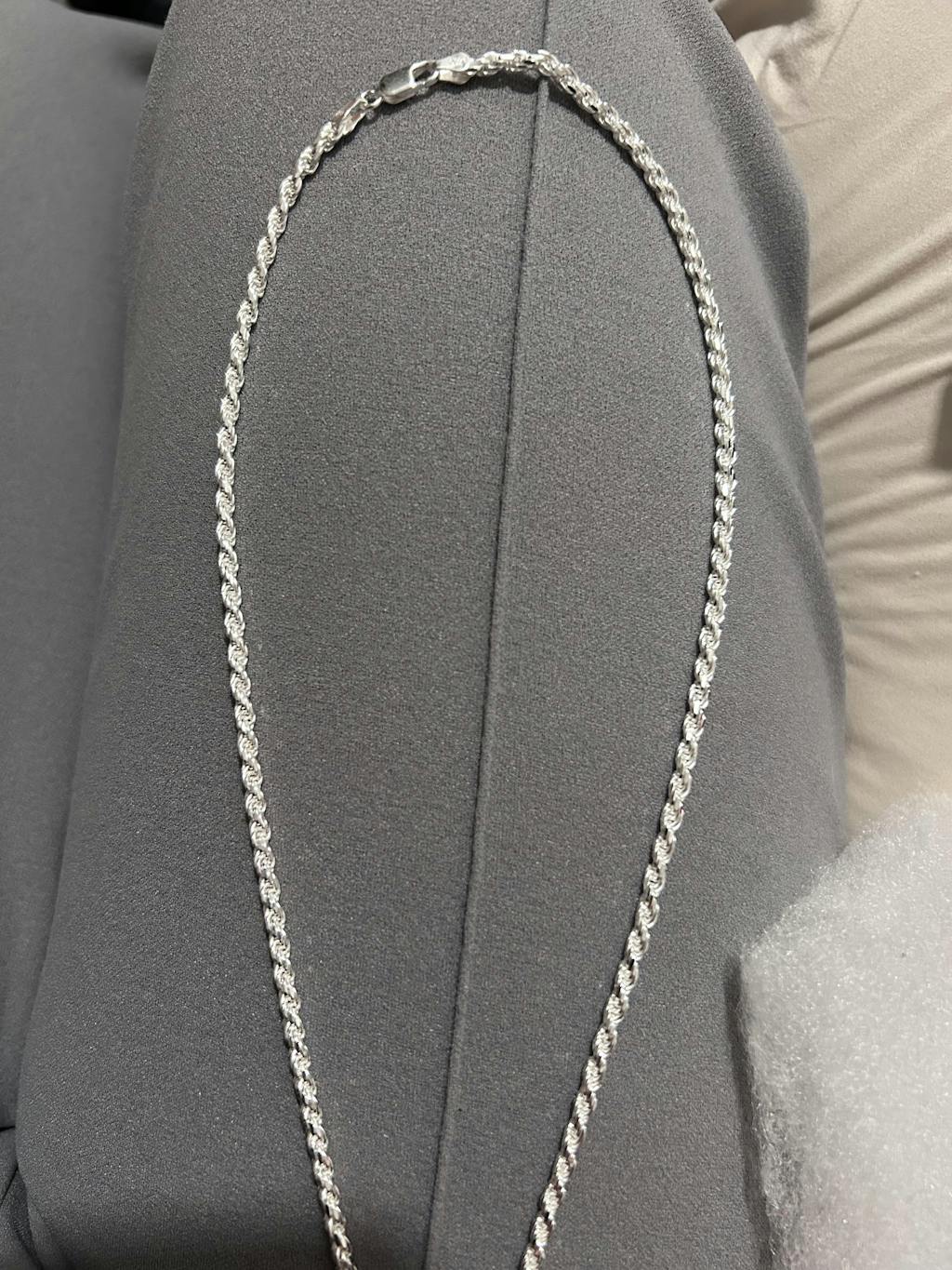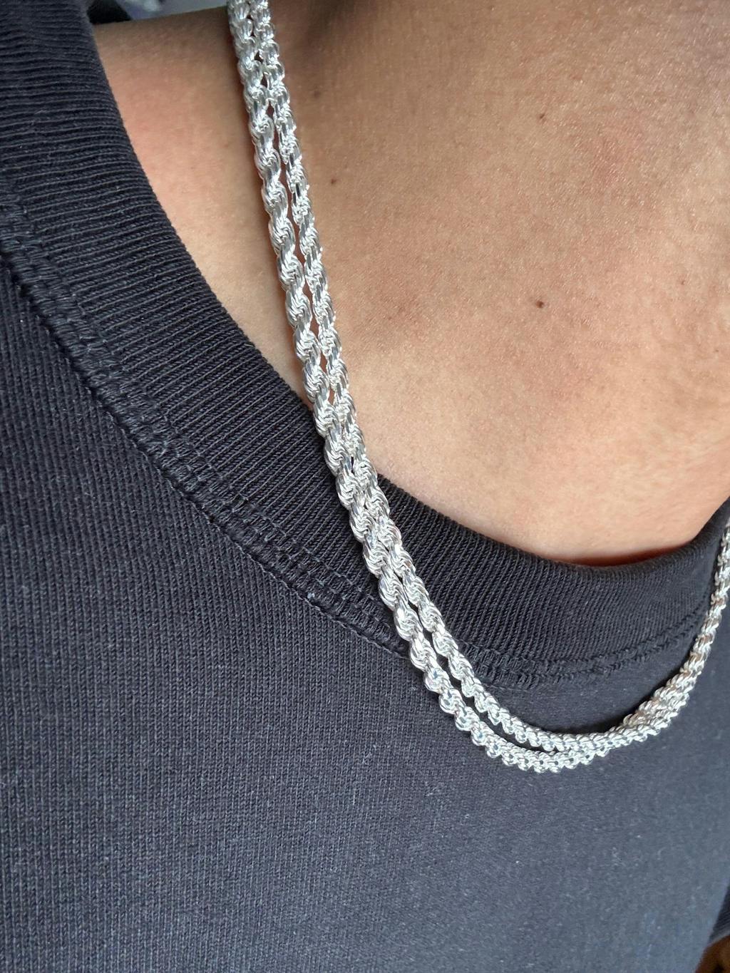 The 3mm Sterling Silver Rope Chain is skillfully made and has a diamond cut surface to capture light from all directions. This chain will always sparkle, whether you wear it to your most formal event or your morning workout.